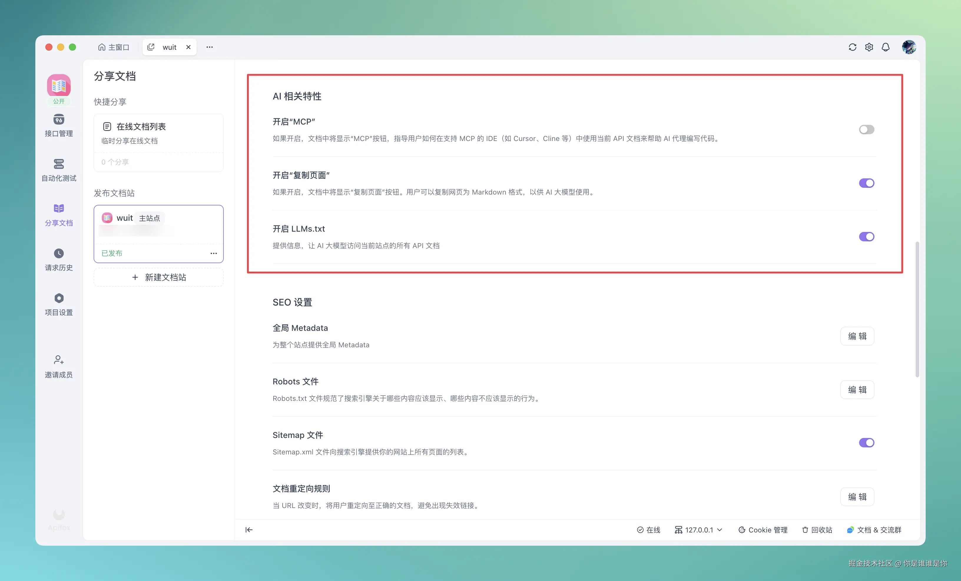 值得一提的是,Apifox 还集成了 AI 相关特性(比如 MCP、LLMs.txt),这在 API 文档工具中是比较前沿的功能应用。这种对新 AI 技术的积极拥抱体现了 Apifox 在产品创新方面的前瞻性,而 Apipost 在这方面则表现不足。