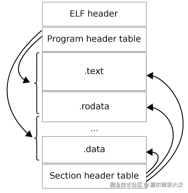 ELF Header: 在文件的开始,描述整个文件的组织.即readelf -h app看到的内容Program Header Table: 告诉系统如何创建进程映像.用来构造进程映像的目标文件必须具有程序头部表,可重定位文件可以不需要这个表.表描述所有段(Segment)信息,即readelf -l app看到的前半部分内容.Segments:段(Segment)由若干区(Section)组成.是从加载器角度来描述ELF文件.加载器只关心ELF header,Program header table和Segment这三部分内容。 在加载阶段可以忽略 section header table 来处理程序(所以很多加固手段删除了section header table)Sections: 是从链接器角度来描述ELF文件. 链接器只关心ELF header,Sections以及Section header table这三部分内容。在链接阶段,可以忽略program header table来处理文件.Section Header Table:描述区(Section)信息的数组,每个元素对应一个区,通常包含在可重定位文件中,可执行文件中为可选(通常包含) 即readelf -S app看到的内容- 从图中可以看出
