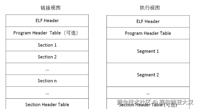 在不同阶段,我们可以用不同视角来理解ELF文件,整体布局如下图所示: