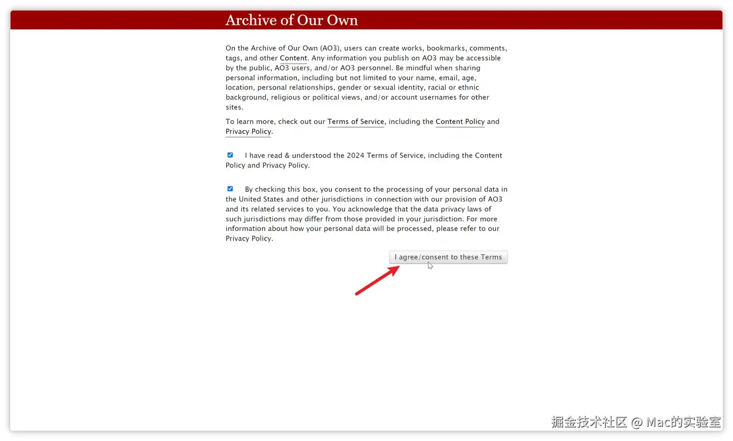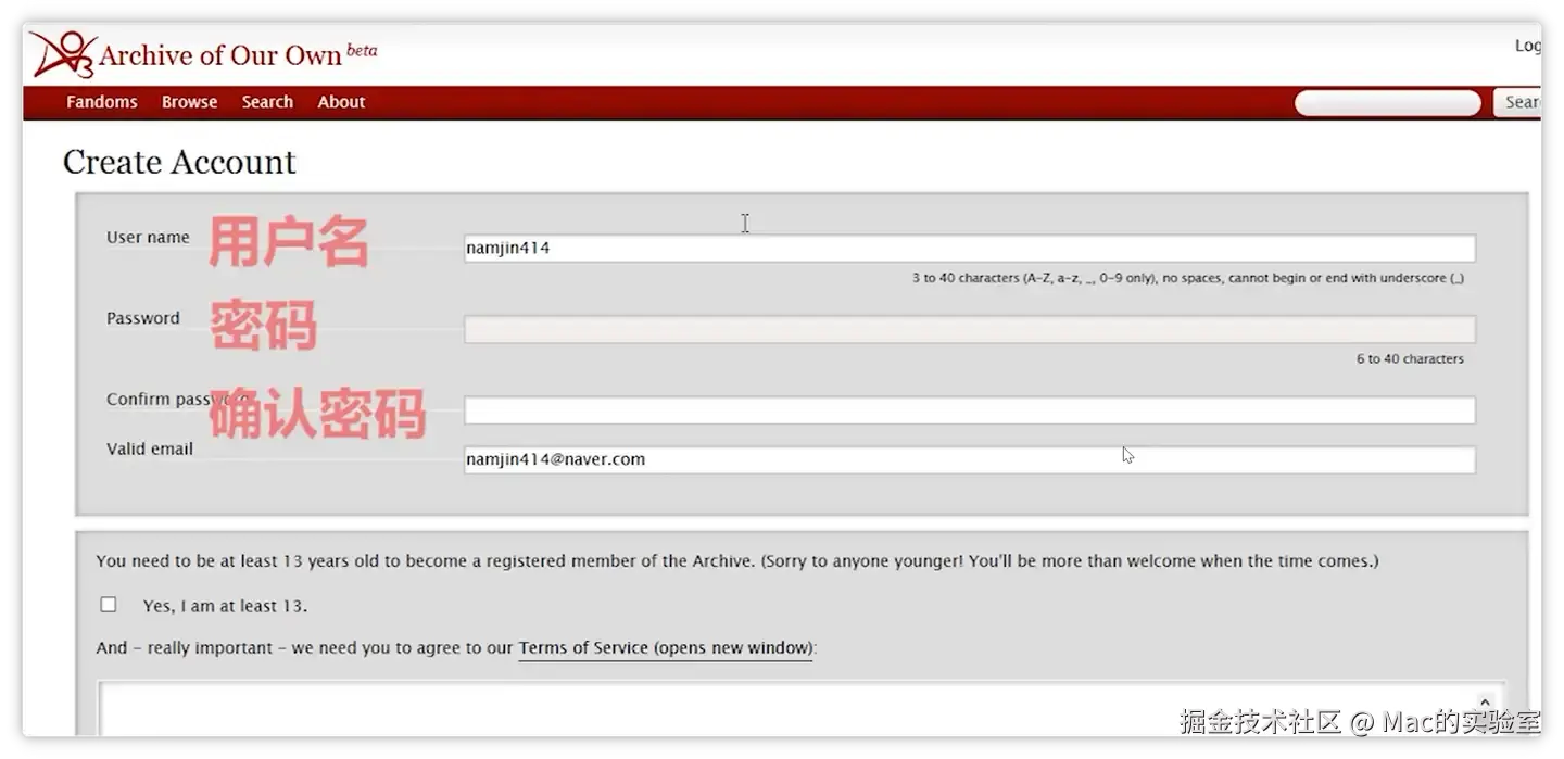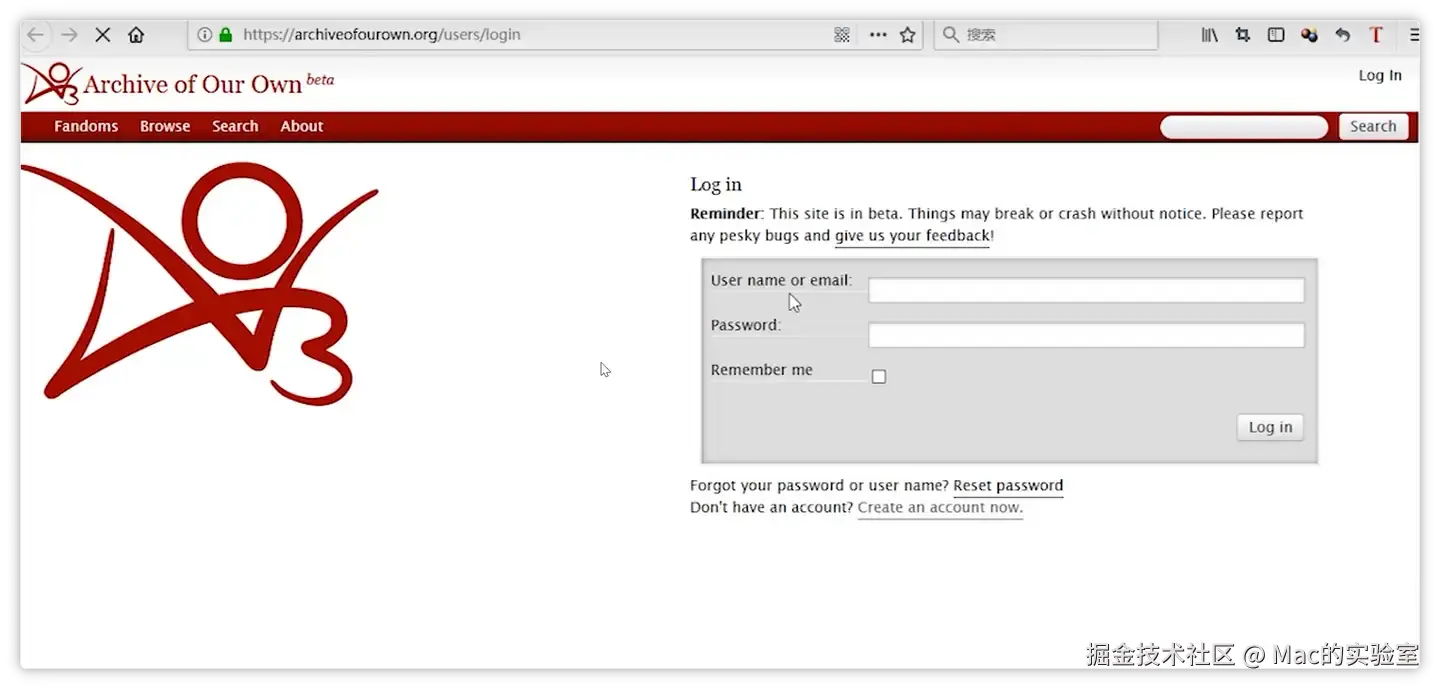 页面会跳转到登陆页,这时我们就可以用用户名或邮箱、密码登陆即可。觉得麻烦不想折腾、很着急没有时间和耐心等待的伙伴,可以在公众号:Mac的实验室 后台回复【ao3】可快速获取邀请哦!