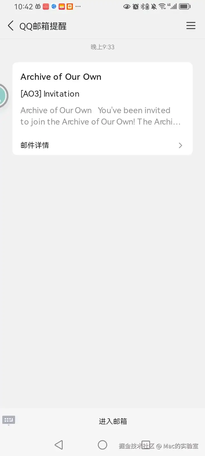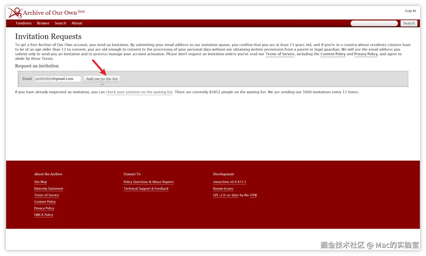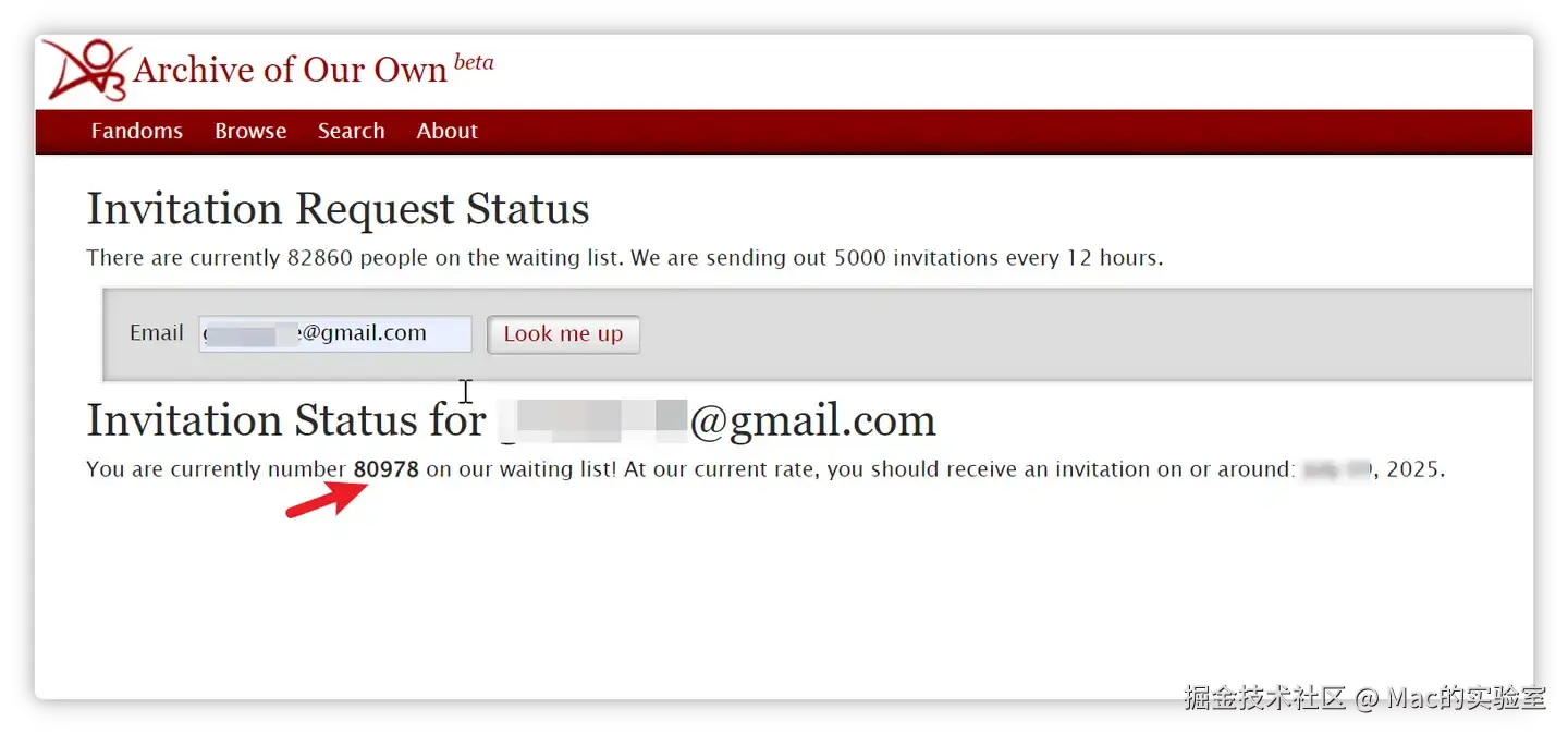 这里显示我前面还有8w用户在排队,官方每12个小时会发送5000个邀请,所以我们需要等待一段时间才能收到邀请。如果很着急没有时间和耐心等待的伙伴,可以在公众号:Mac的实验室 后台回复【ao3】可快速获取邀请哦