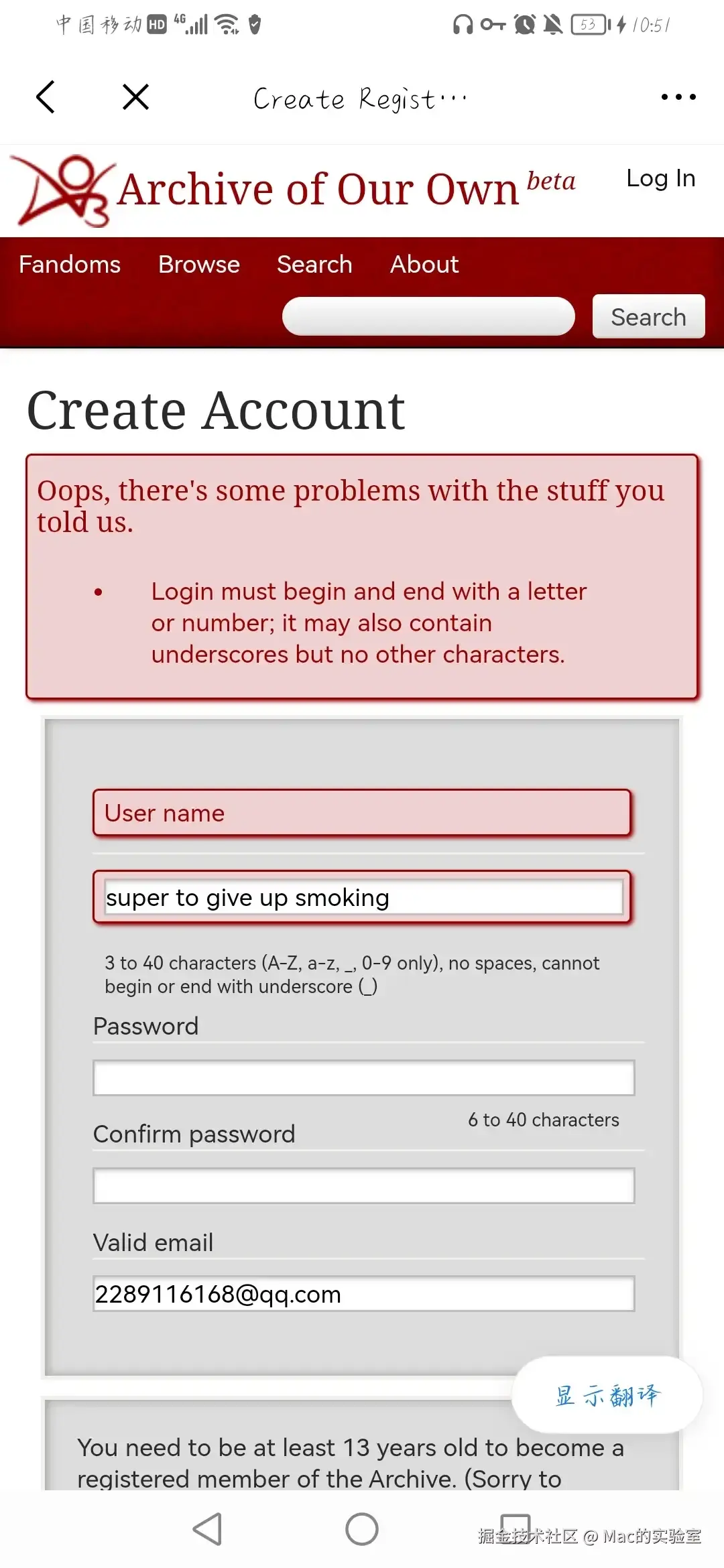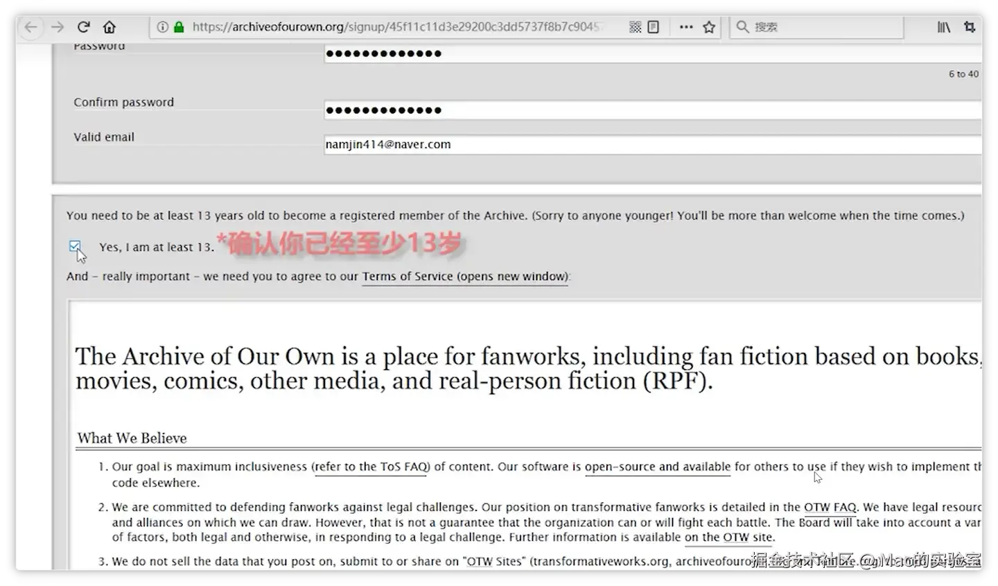 手机上注册也是一样,浏览器打开AO3官网填写邮箱注册