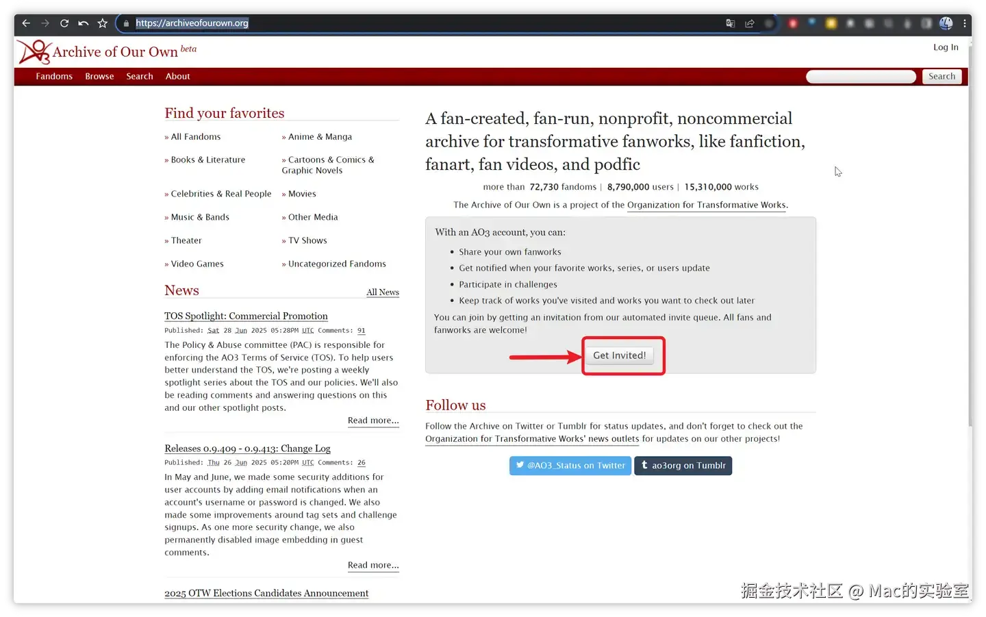 由于AO3的注册是邀请制,所以我们要点上图的【Get Invited】获取邀请注册