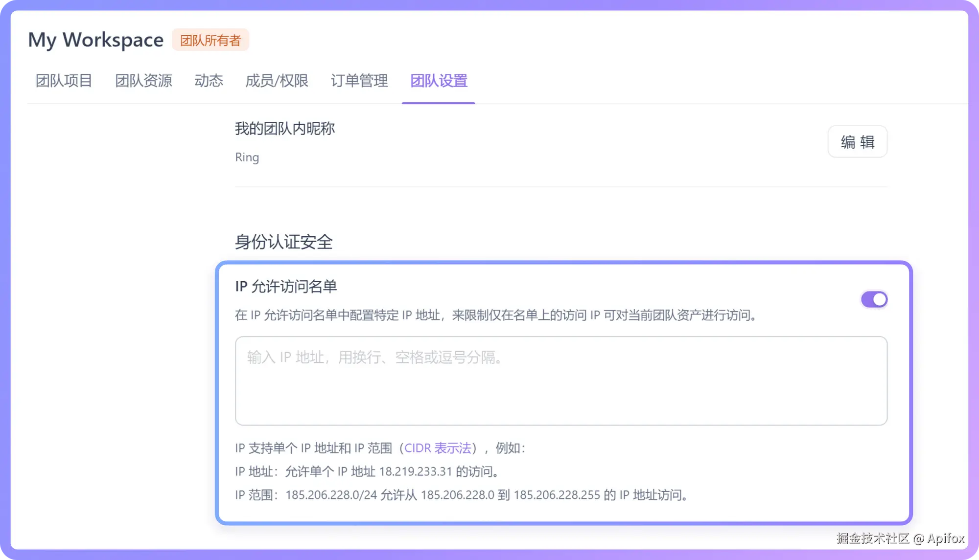 「IP 白名单」的方式除了用于发布的 API 文档,也可以用于 Apifox 团队权限控制,你可以在「团队设置」里启用 (注:需商业专业版才支持)。