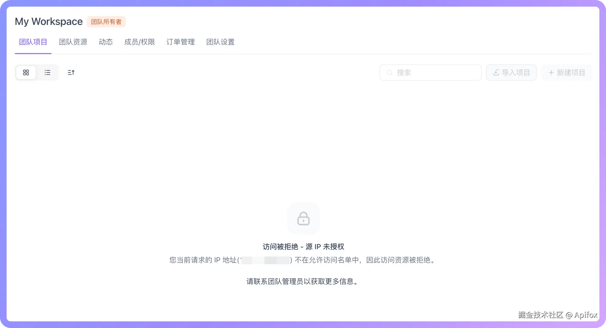 启用后,只有来自指定 IP 的网络环境,团队成员才能进入项目查看内容,IP 不对,整个团队都无法访问。