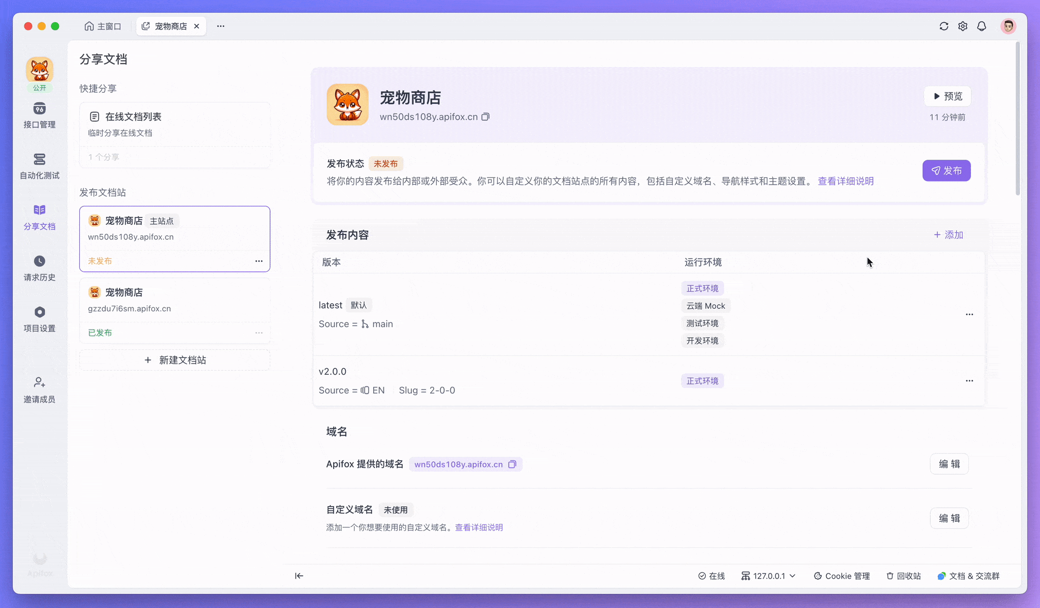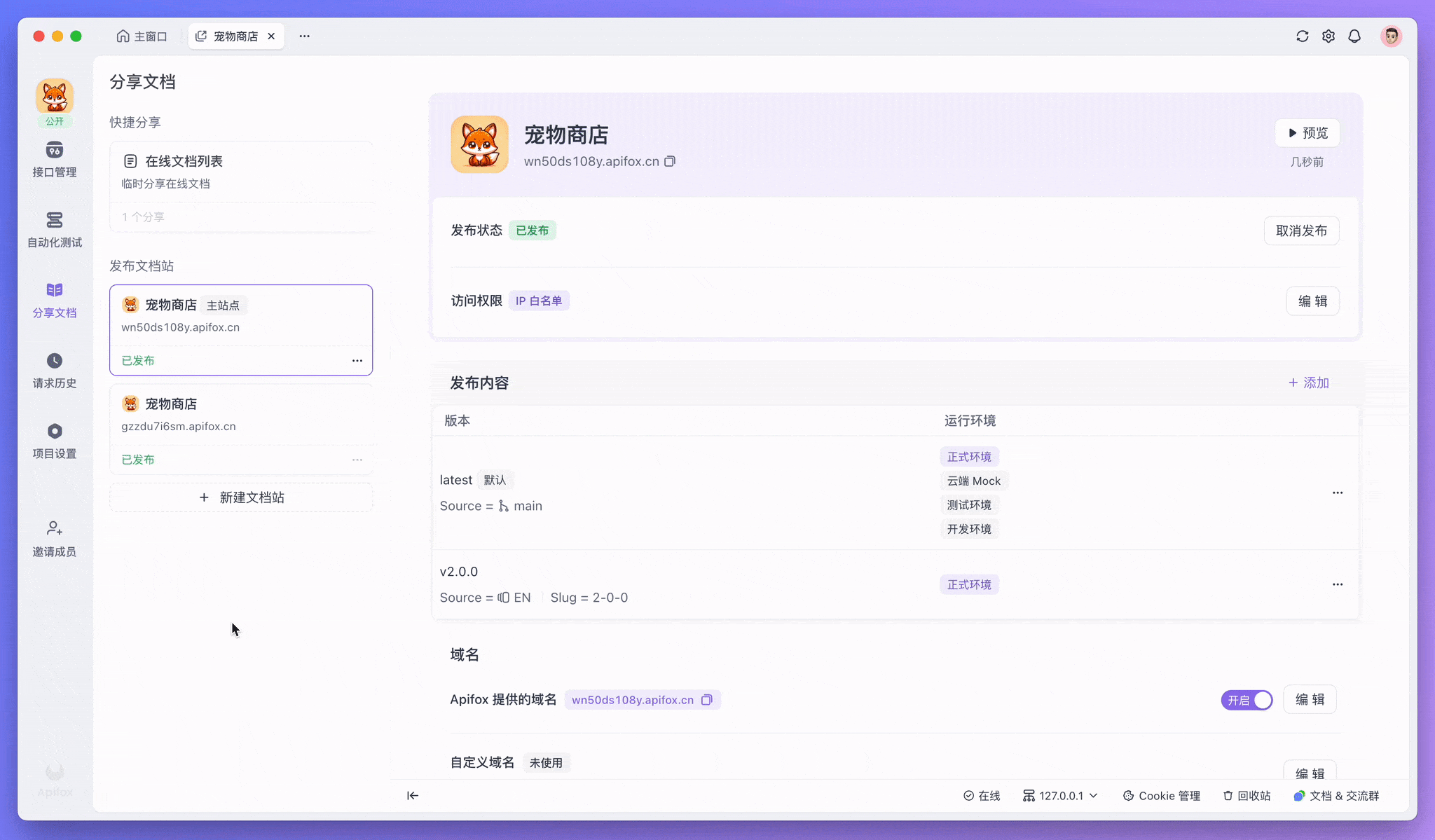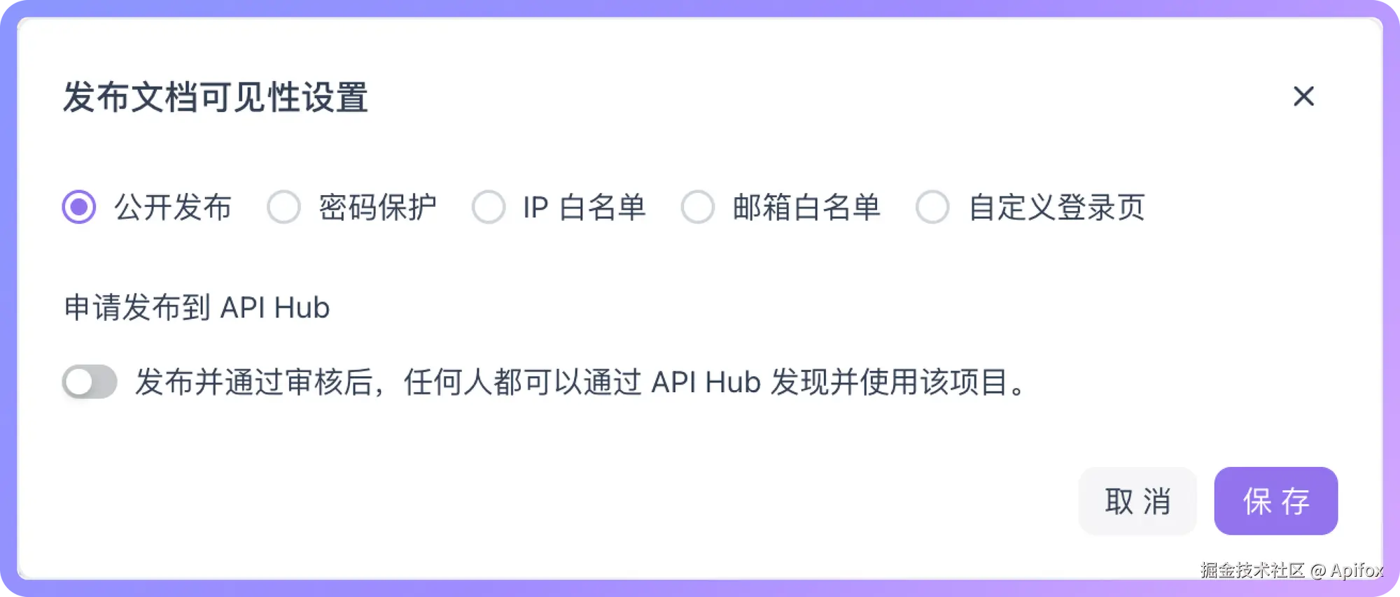 如果你的 API 本身就是开放给所有人用的,比如你们产品的开放接口,直接选择「公开发布」就行,任何人拿到链接都能查看文档。