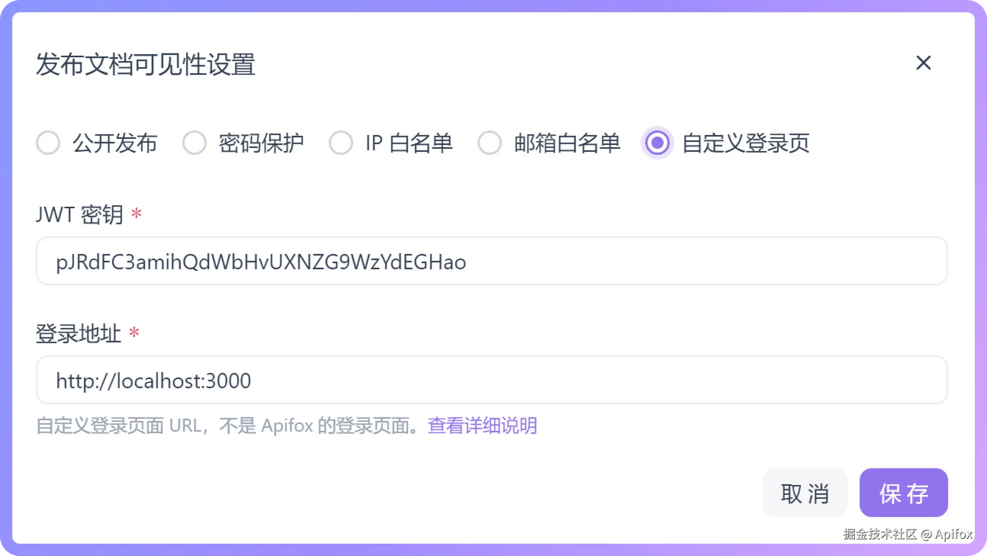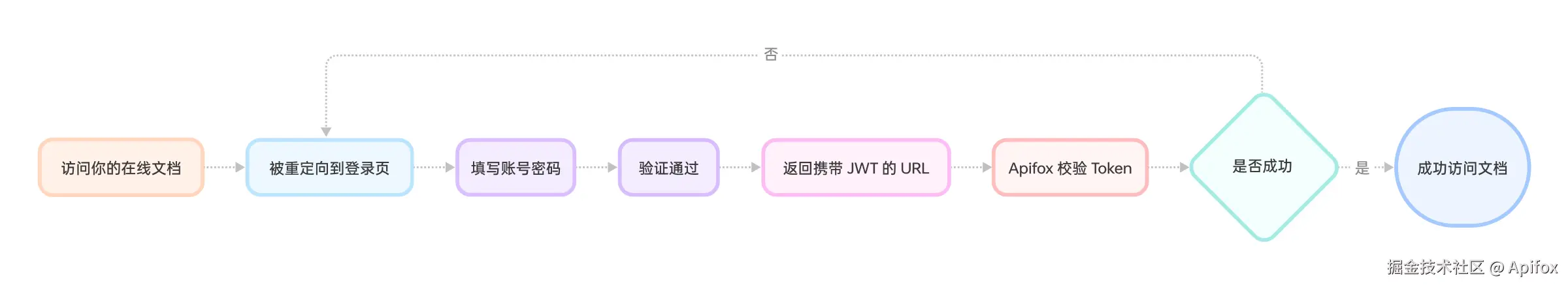 工作流程是这样的:用户访问文档站时,先跳转到你自己的登录页面。用户完成身份验证后,你的服务器生成一个 JWT Token,然后把用户重定向回文档站,同时把 Token 作为参数传过去。Apifox 验证这个 Token,通过了就允许访问。