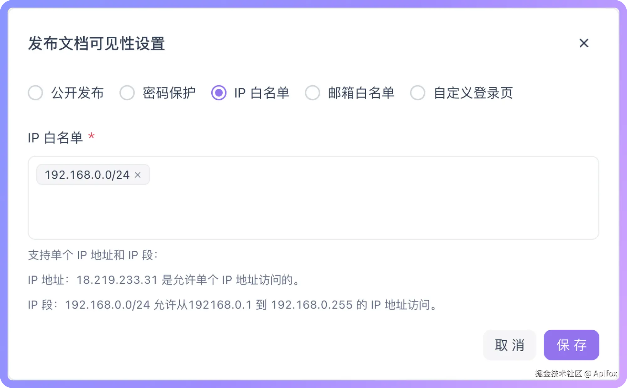 这种方式在企业环境中很实用,比如只允许公司内网访问,或者只允许合作方从他们的办公网络访问。你可以设置单个 IP 地址,也可以设置整个 IP 段,访问文档时 IP 不匹配将被拒绝访问。