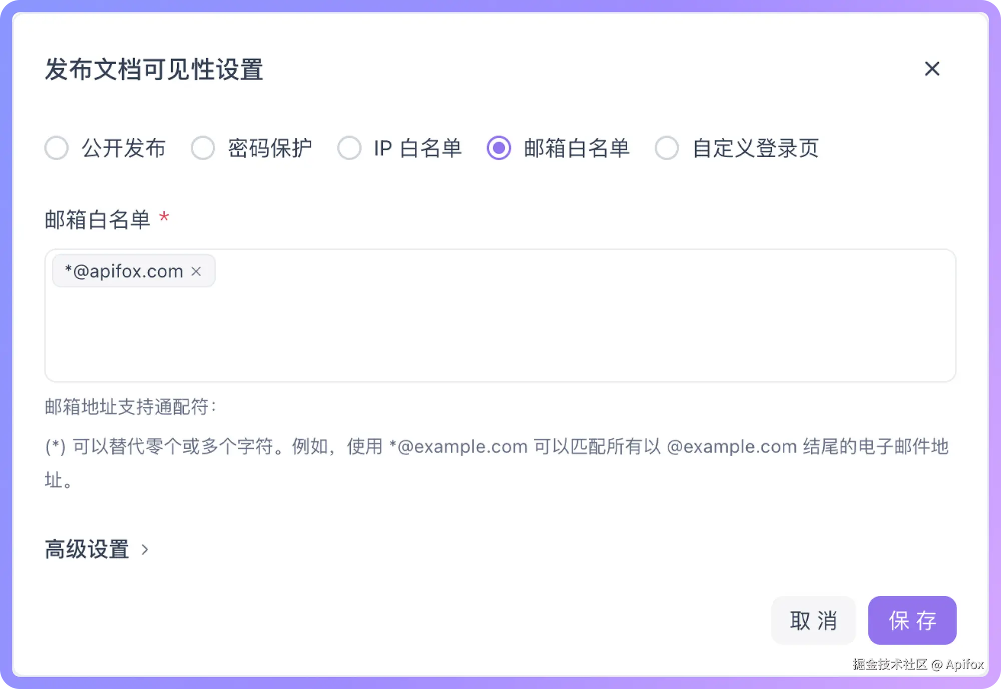 它支持通配符,比如你设置 *@apifox.com,那么所有使用 @apifox.com 邮箱的人都能访问。