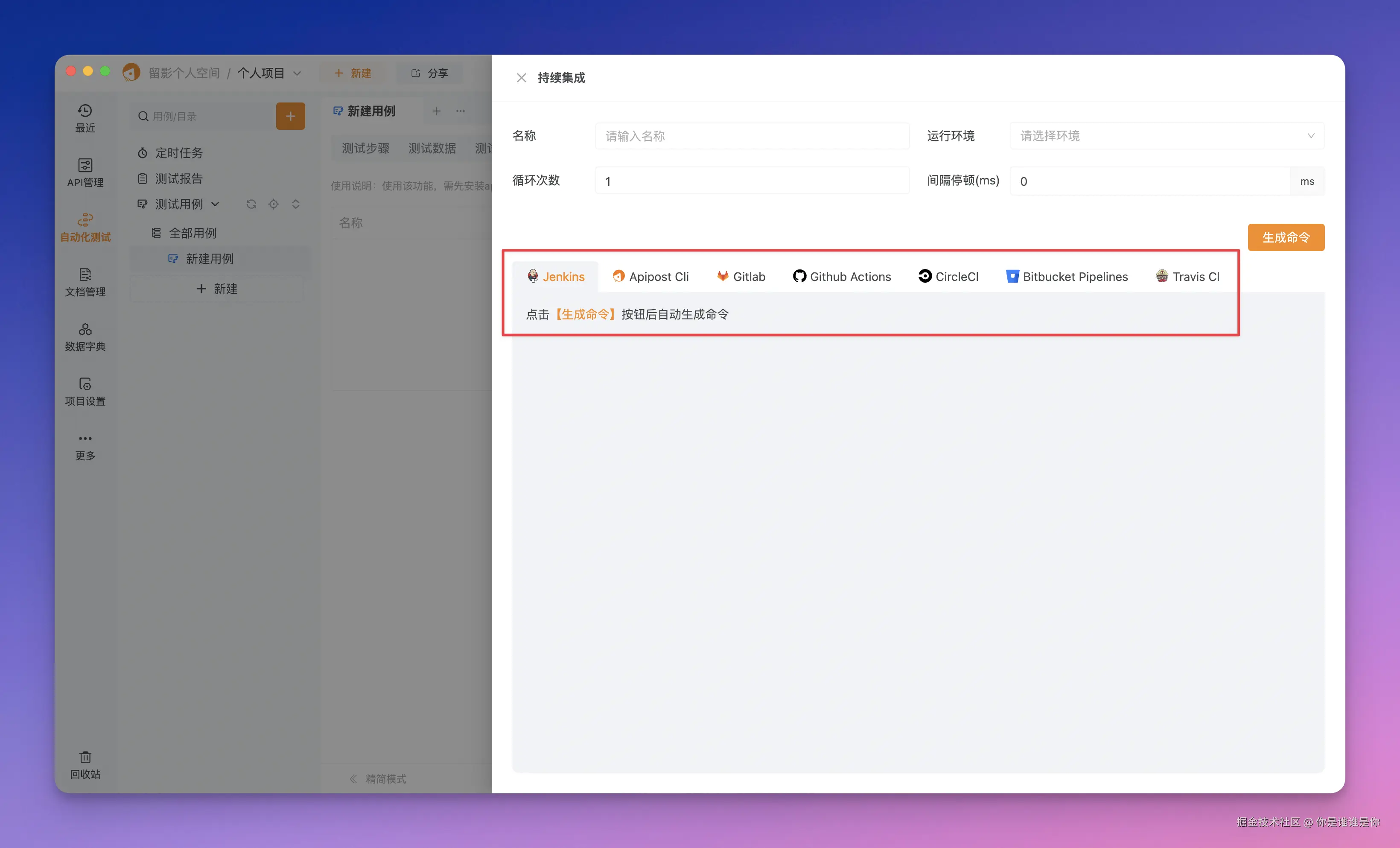 Apifox:提供功能强大且易于使用的 CLI 工具,可深度集成主流 CI/CD 平台,如 Jenkins、GitLab CI、GitHub Actions、Azure DevOps 等。同时配备详细文档,支持在流水线中自动化执行 API 测试、文档生成、Mock 服务部署等操作。