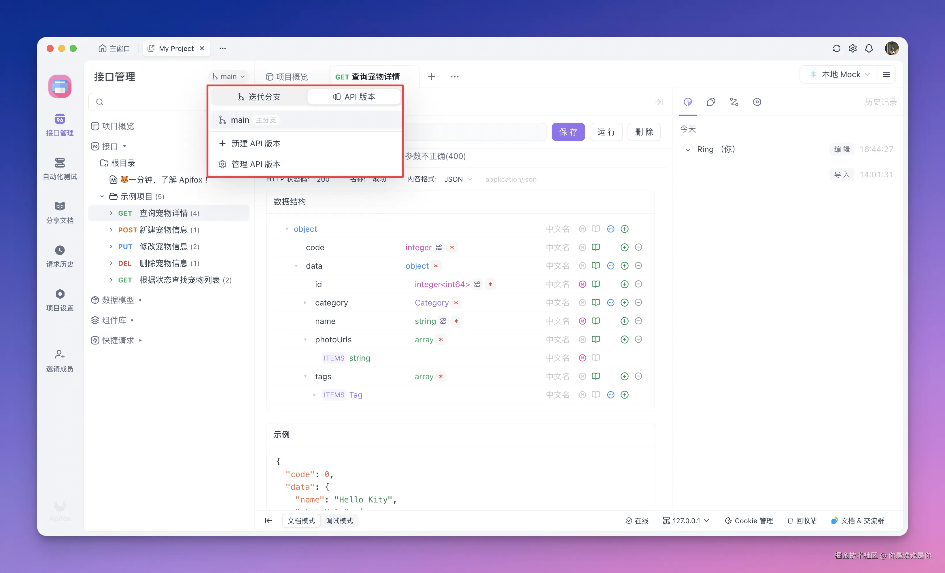 Apipost:目前只有单个接口内的历史记录,不支持 API 版本管理功能,因此在多版本 API 设计和管理上存在局限,也没有分支功能。