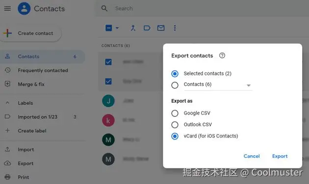 如果您的联系人已与您的 Google 帐户同步,Google 通讯录网页版提供了一种简单的方法,可以将其以 VCF 文件的形式直接导出到您的电脑。这对于通过浏览器管理联系人并希望更好地控制导出内容的用户来说非常理想。但是,此方法仅在您的联系人已同步到您的 Google 帐户时才有效。
