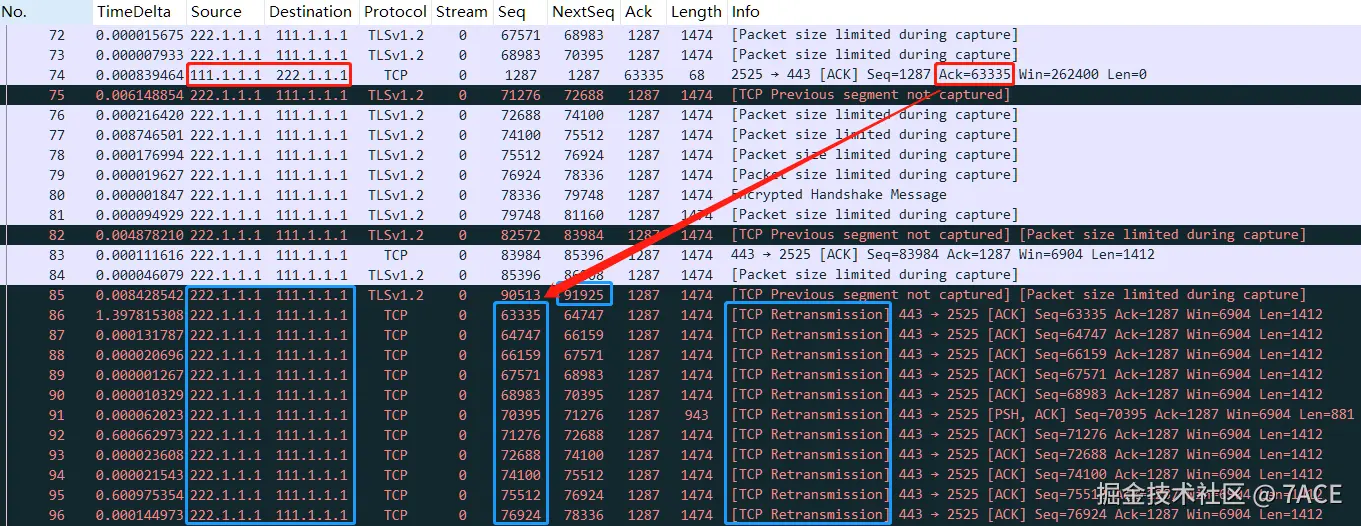 - No.74 客户端 ACK 正常传输到了服务器端,由于没有包括 SACK 以及 3 个 Dup ACK 的支撑,服务器端一直等到 RTO 超时后,才进行了 No.86 Seq Num 63335 至之后的所有数据分段的超时重传。