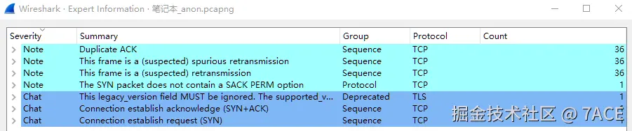 既然是笔记本终端打不开域名的故障现象,那么就可以先从笔记本捕获数据包开始入手。客户端 IP 192.168.0.1 和服务器端 IP 222.1.1.1 在标准的 TCP 三次握手和 TLS 握手完成之后,可见正常传输了一段时间后出现了大量的异常,通过专家信息统计,也可以看到出现了包括疑似虚假重传/重传,以及 Dup ACK 等问题。
