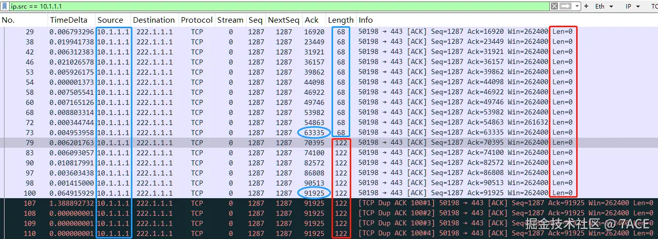- 同样是客户端源 IP 10.1.1.1 发送的 ACK,但从 No.79 开始,ACK Len 长度由之前的 68 变为了 122,而 TCP Len 均为 0;