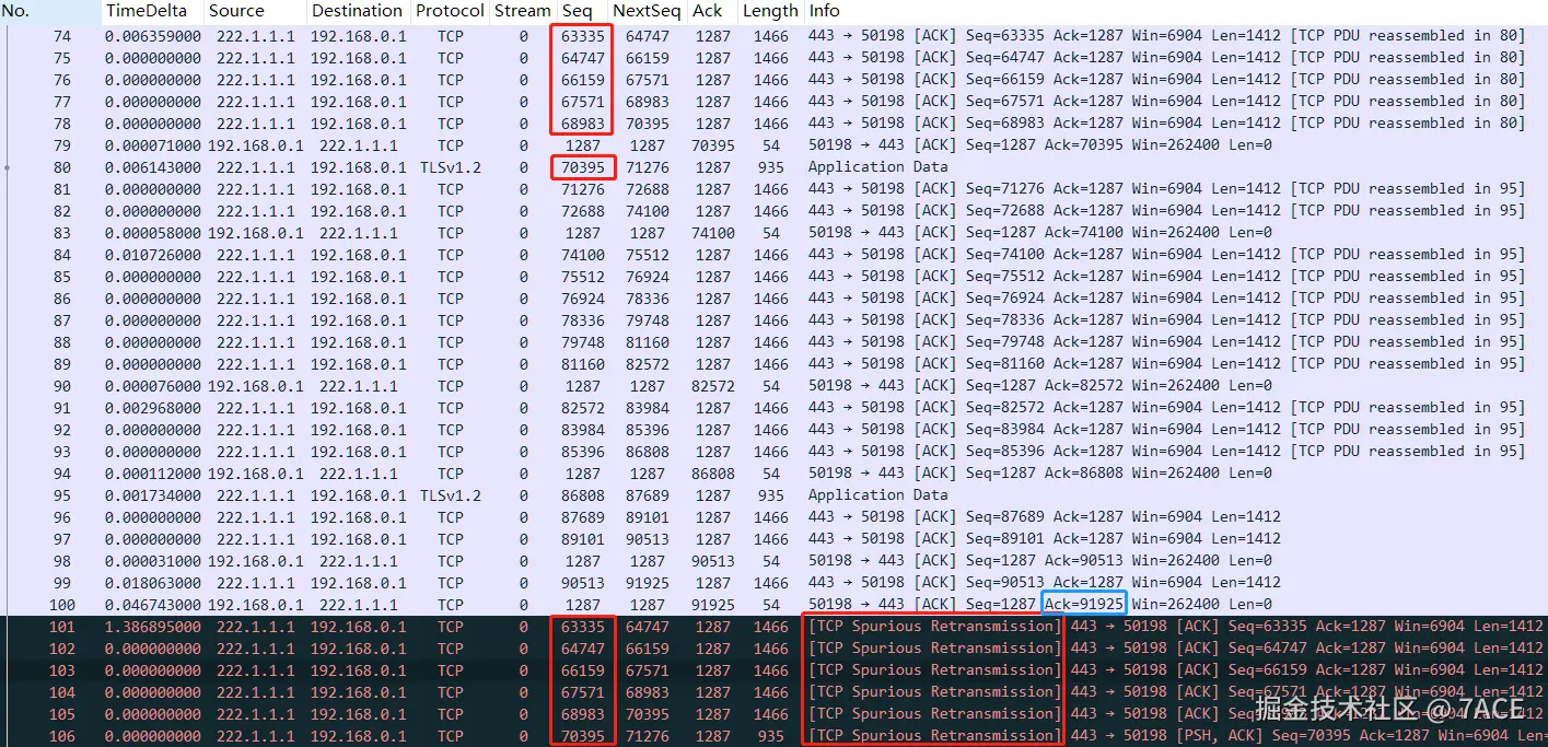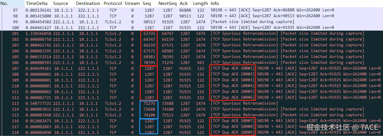 - 而从 No.107 开始之后的 ACK 数据包,ACK Num 均为 91925,全部标识为 Dup ACK,说明收到了重复的数据分段,也就是上图中的 No.101 开始的 TCP 虚假重传数据分段。