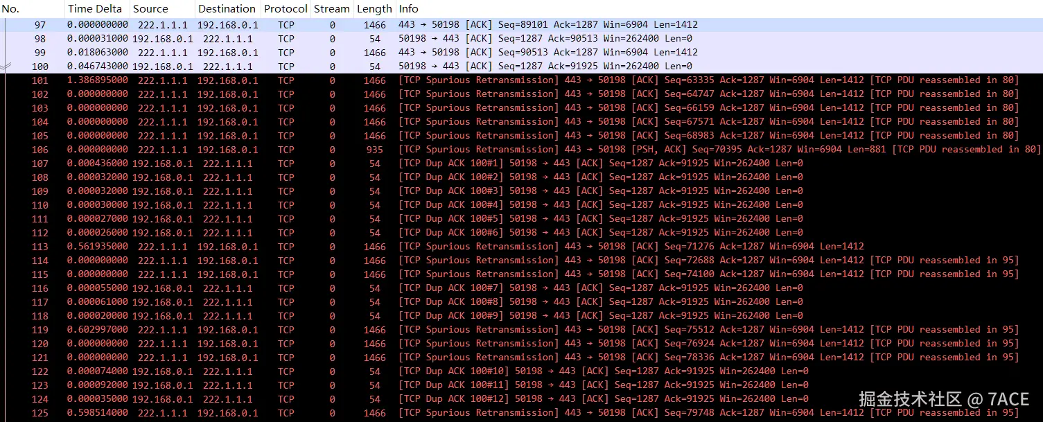 直接跳转至异常处,可以看见从数据包 No.101 开始至最后,连续出现了 TCP Spurious Retransmission + TCP Dup ACK 的问题组合。