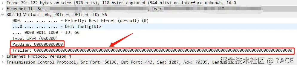 TCP Len 为 0 的纯 ACK ,为什么整个数据包长度会由 68 变成了 122,通过对比 No.73 和 No.79 两个 ACK 数据包详情发现了问题所在,除了正常 ACK 满足数据帧最小长度 64 字节所填充的 Padding 全 0 数据之外,在 No.79 这个异常 ACK 中又多出现了一段 Trailer 全 0 数据,长度为 54 字节。