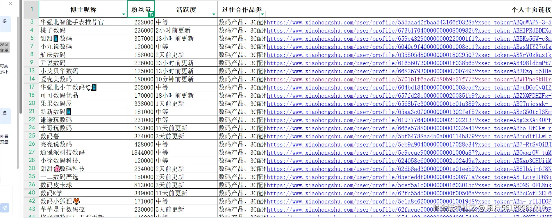 列包含 “达人昵称”“粉丝量”“过往合作品类”(如 “数码产品”“3C配件”)“活跃度”““可点击主页链接”。