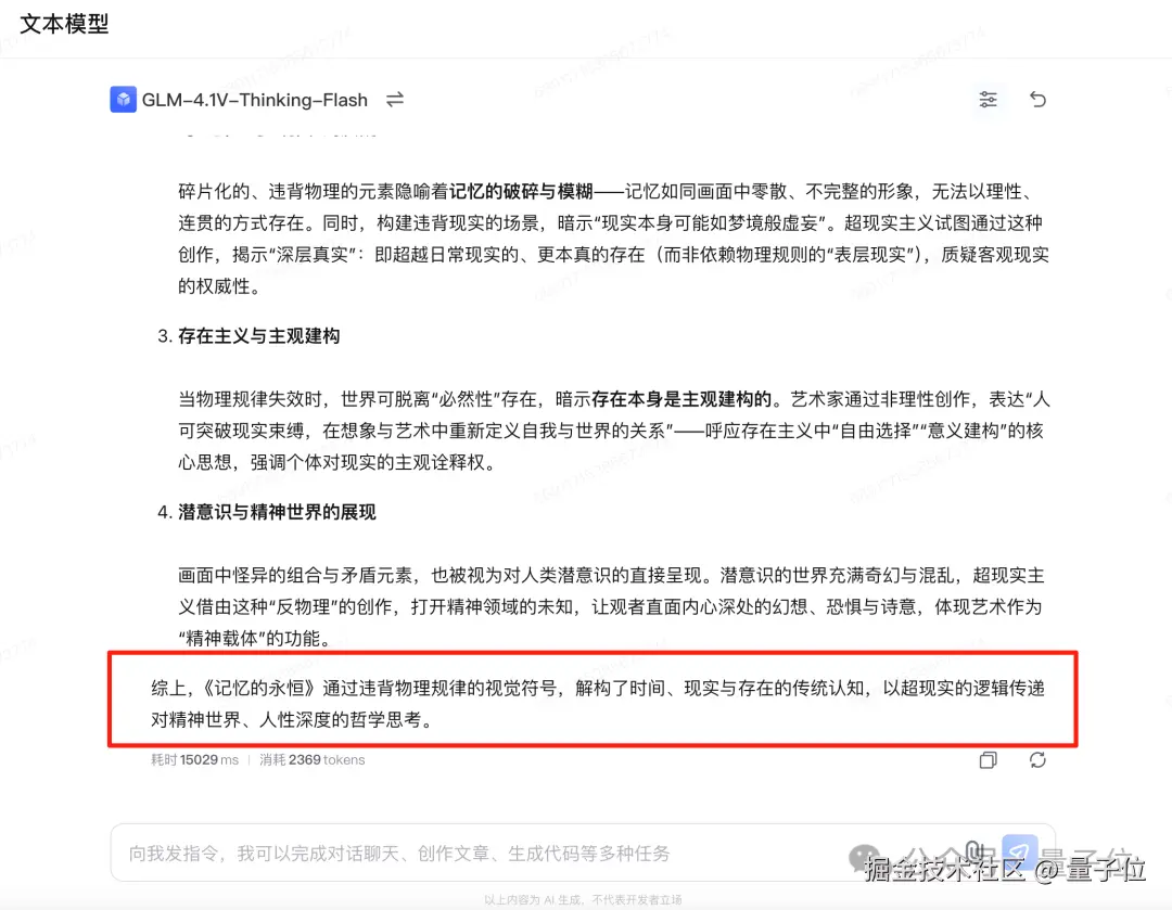 可以看到,GLM-4.1V-9B-Thinking 先是看出了这是西班牙超现实主义画家萨尔瓦多 · 达利创作的《记忆的永恒》;然后也道出了画作中存在违背物理的视觉符号等。