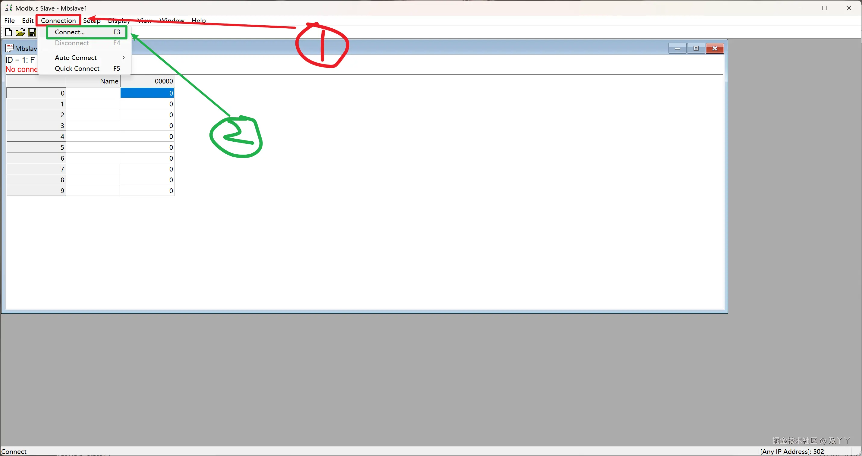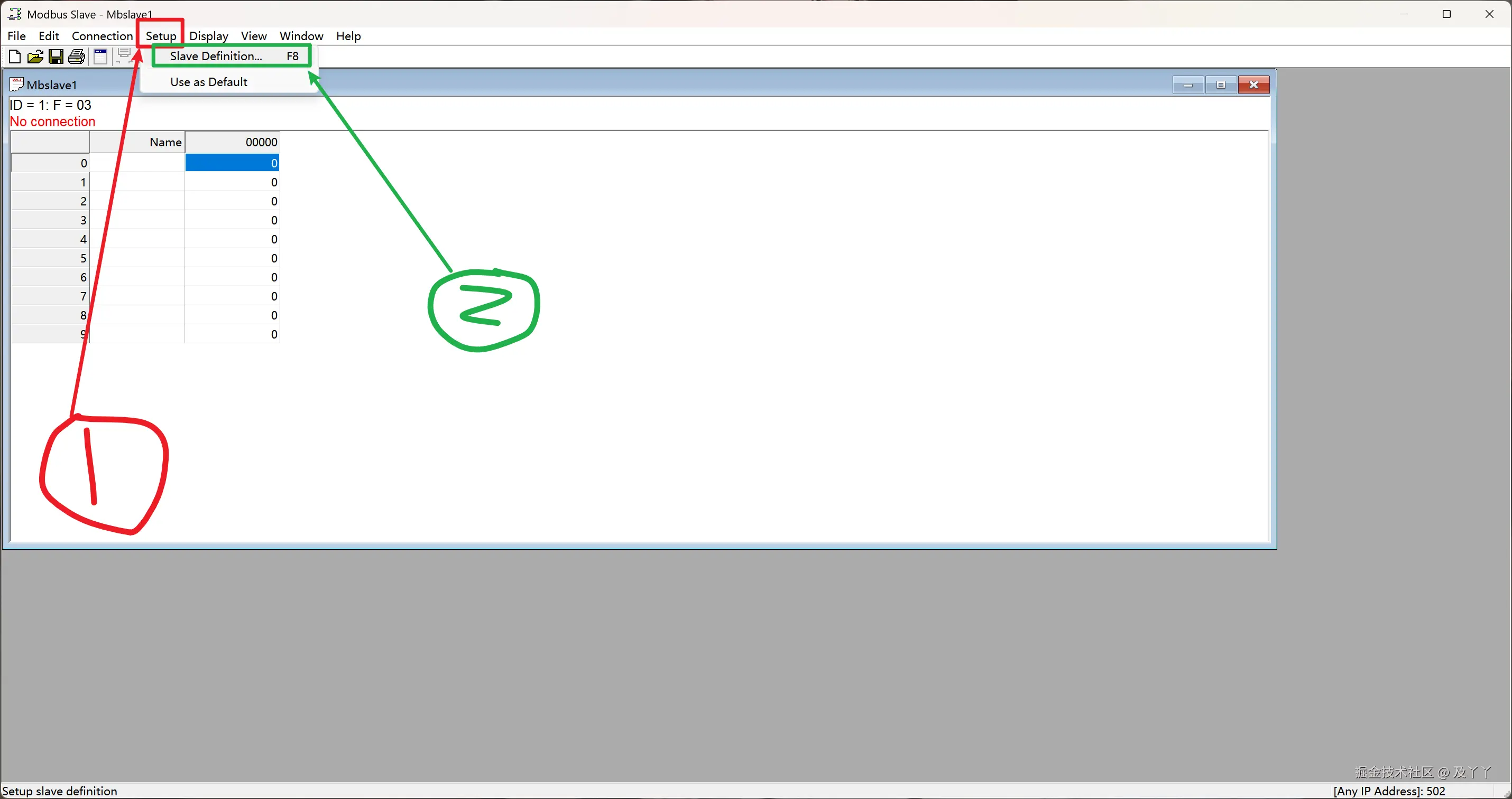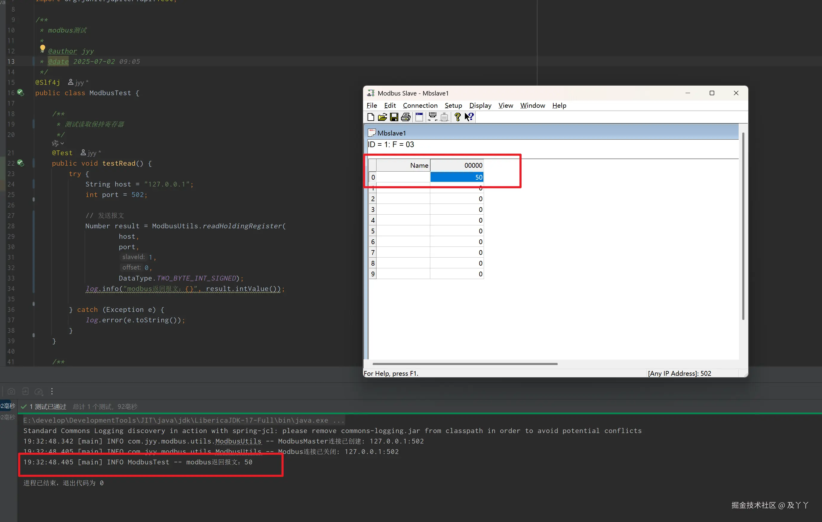 流程:我们先将Modbus Slave,从站id为1。保持寄存器地址为0的数据修改成50,再用代码是否读取到。