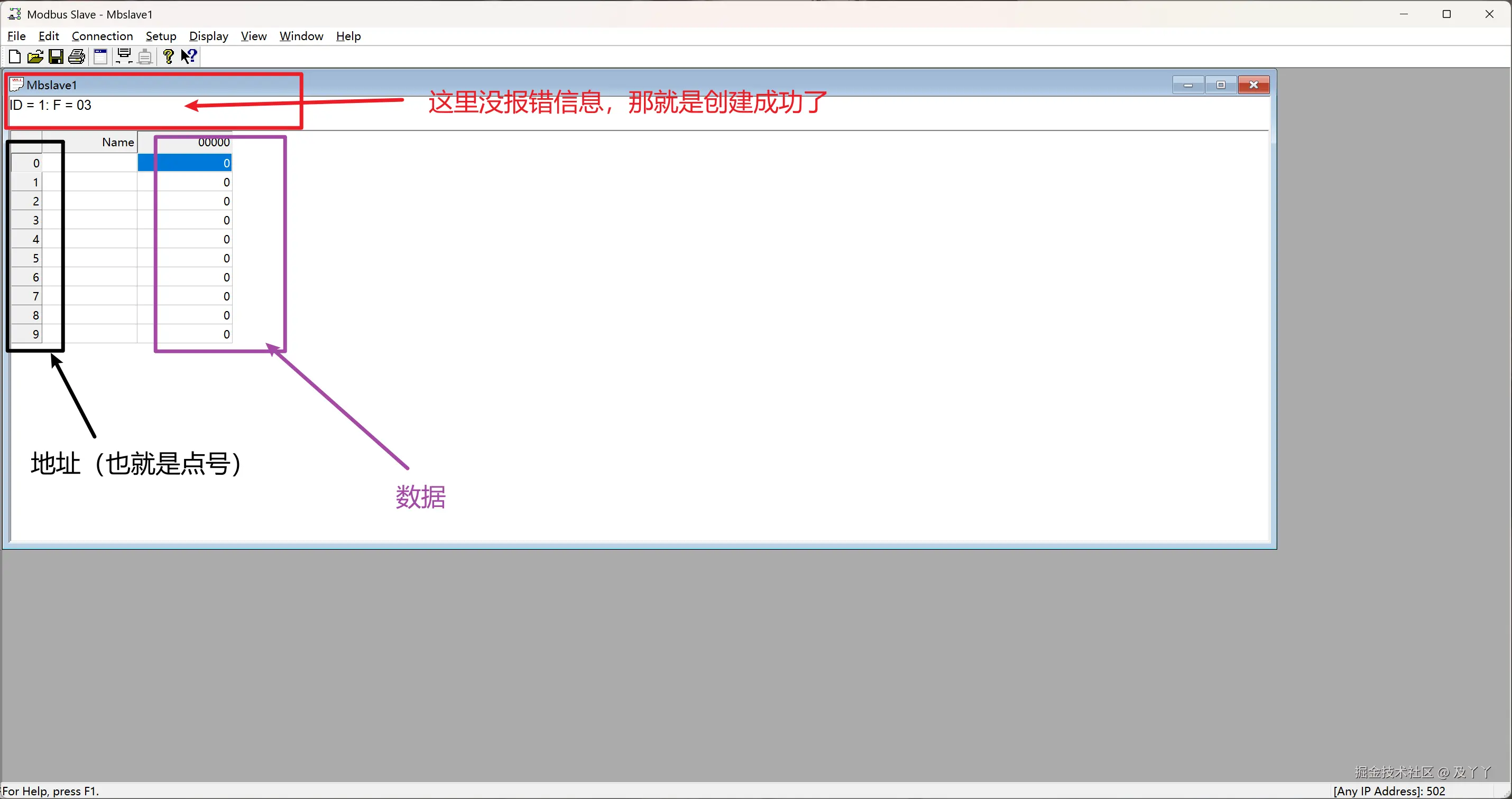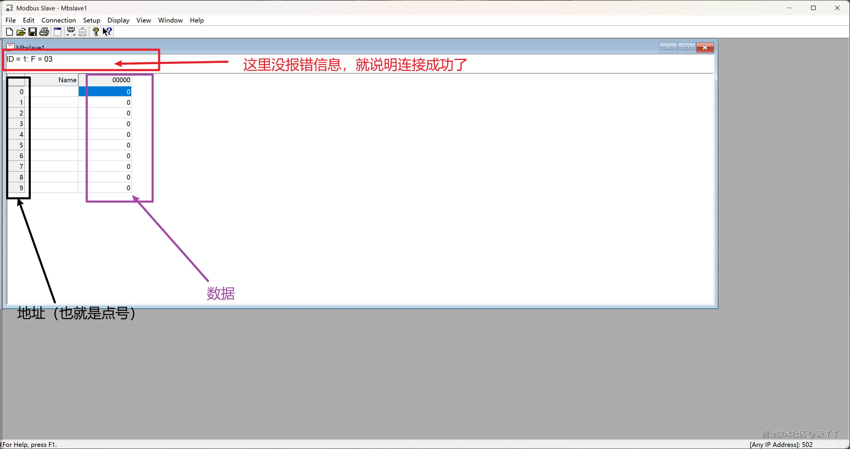首先,打开Modbus Slave,将点位0的值设置成17402