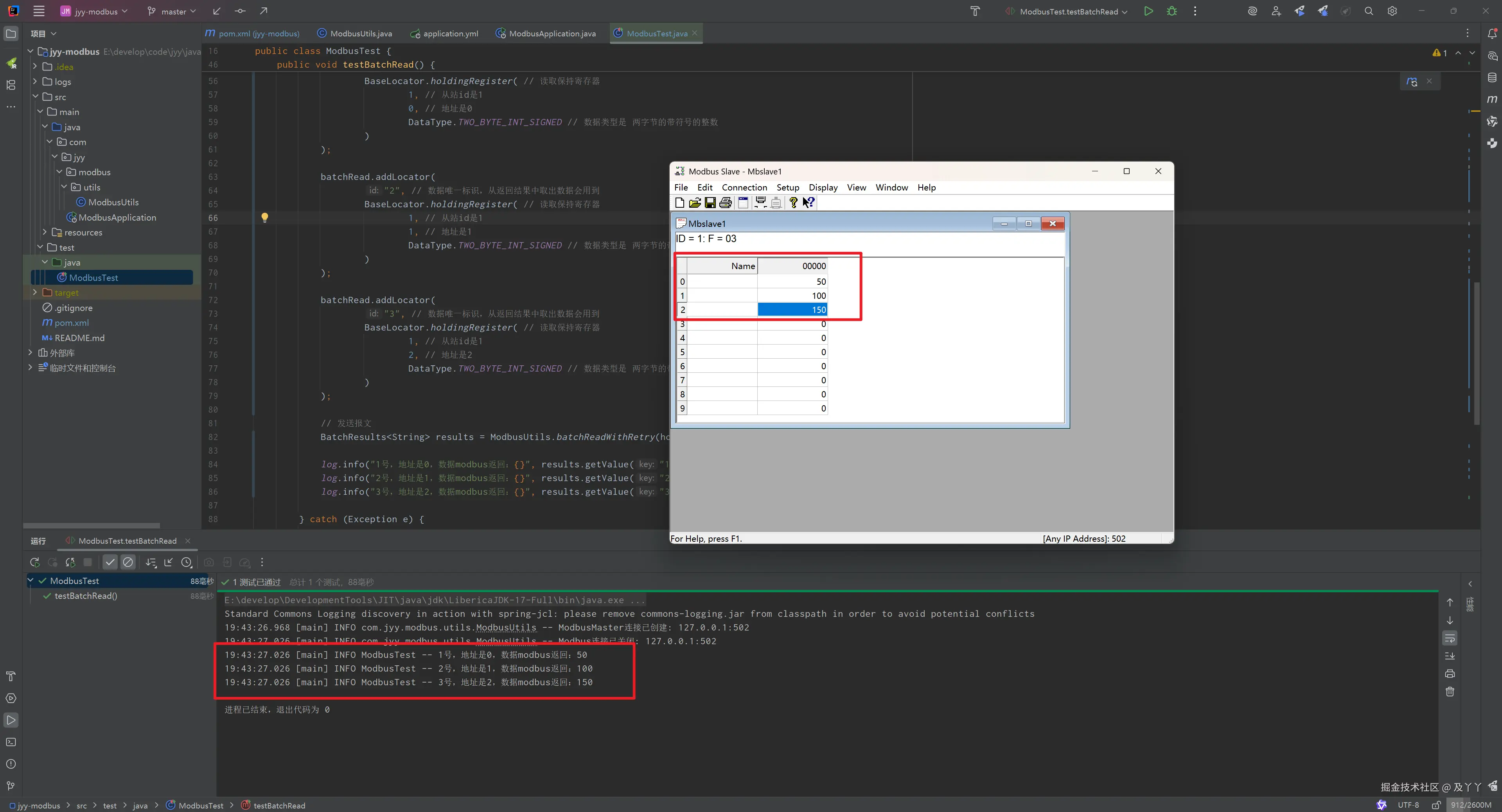 流程:我们先将Modbus Slave,从站id为1。保持寄存器地址为0的数据修改成50,地址为1的数据改成100,地址为2的数据改成150,再用代码是否读取到。