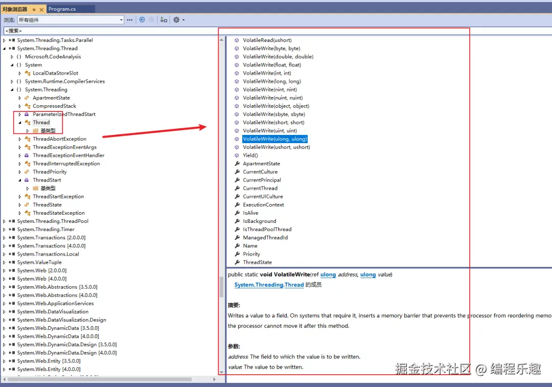 **1、**我们先通过查看类的定义,获得Thread的具体程序集为:System.Threading.Thread,见下图。
