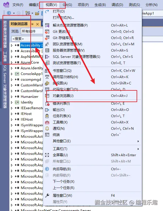 **2、**在Visual Studio的菜单:视图=》对象浏览器,打开对象浏览器窗口;