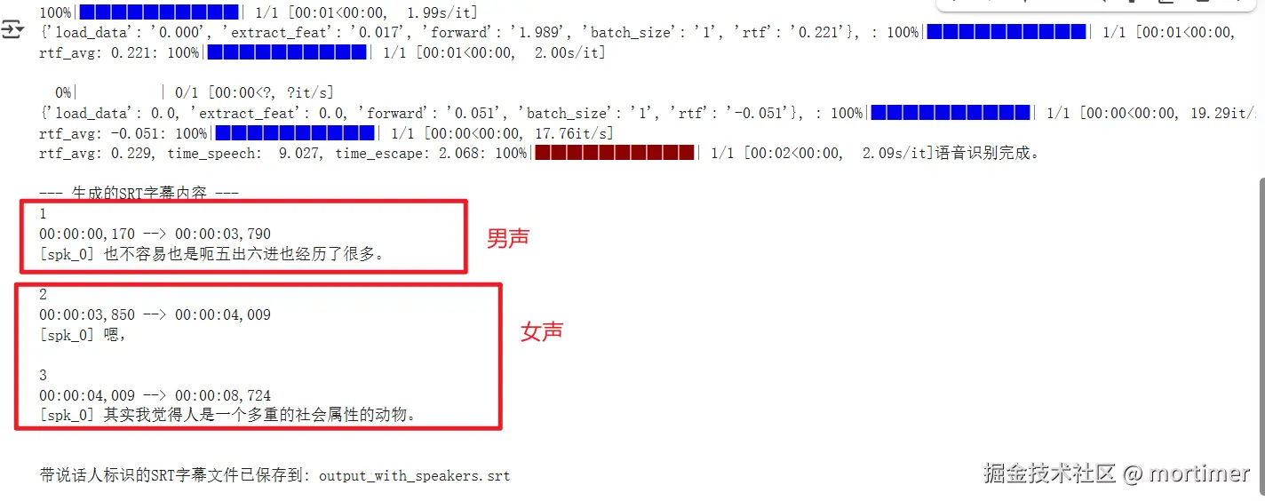 我用官方提供的示例音频进行交叉验证,最终确认了一个残酷的事实:我的代码逻辑已经完全正确,但我的测试音频,对 cam++ 这个模型来说难度太高了。即便我通过 oracle_num=2 参数明确告知模型现场有两个人,它依然没能成功区分。