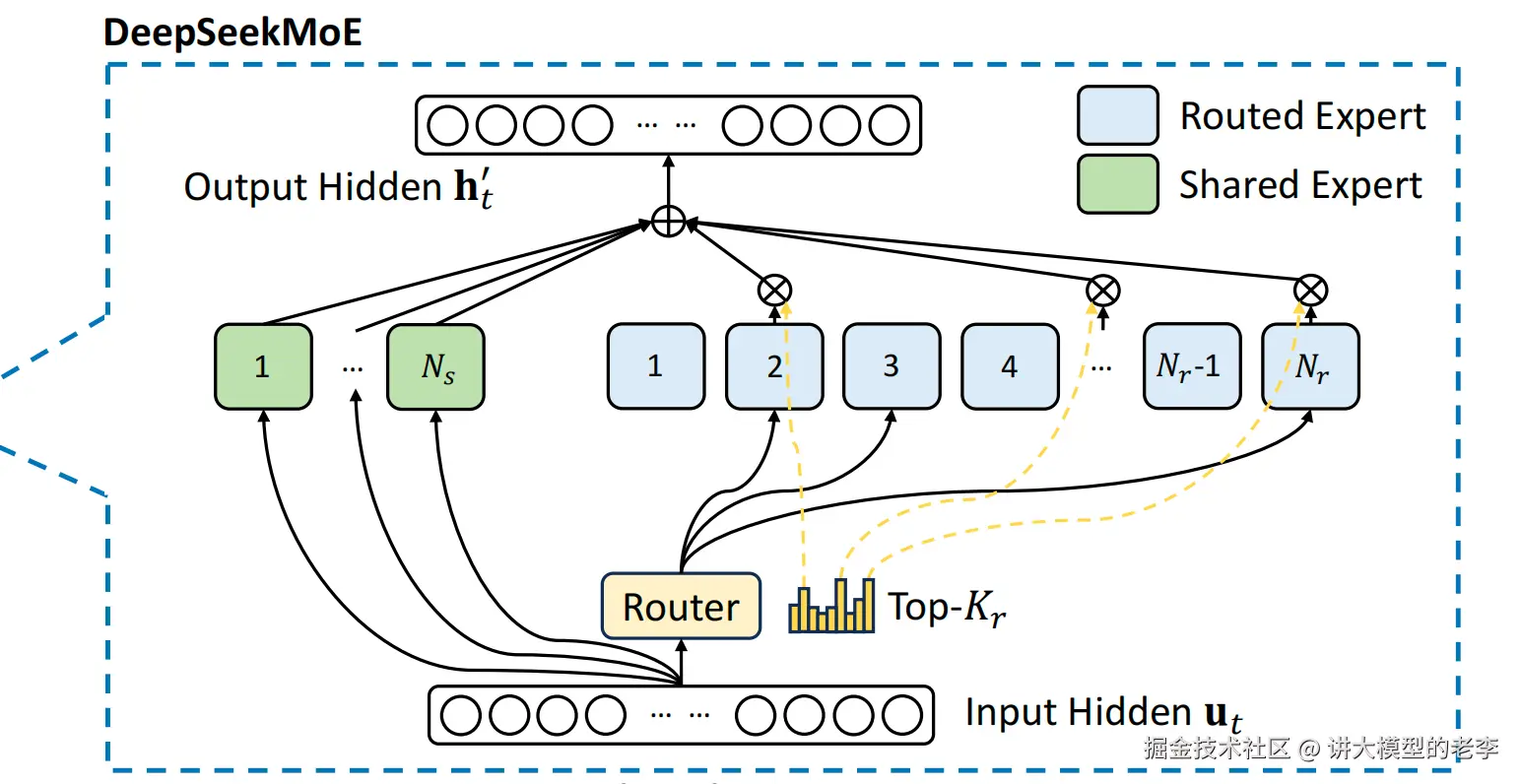 从图中可以看到,其中一部分是共享专家 Shared Expert,而另一部分是路由专家 Routed Expert。共享专家是每次固定都会激活,而路由专家是有选择的稀疏激活。