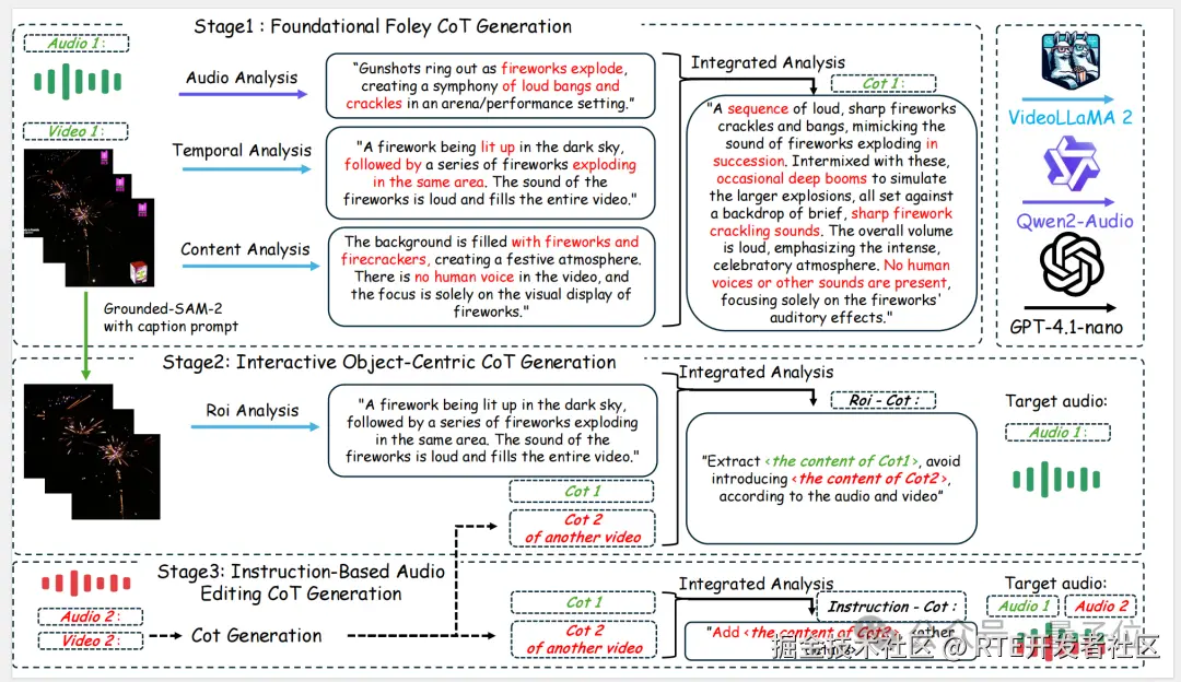 阿里通义语音团队最新开源的泛音频生成模型 ThinkSound,主要用于视频配音,支持每一帧画面都有专属匹配音效。它首次将 CoT 思维链推理引入了音频领域,解决了传统视频配乐技术往往只能生成单调的背景音,而难以捕捉画面中的动态细节和空间关系的难题。引入链式思维(CoT)推理后,整个过程可以拆解为:先分析视觉动态、再推断声学属性,最后按照时间顺序合成与环境相符的音效。即 AI 现在也能像专业音效师一样逐步思考,通过捕捉视觉细节来生成音画同步的高保真音频。