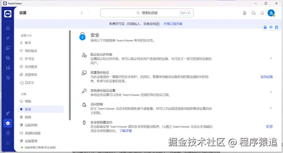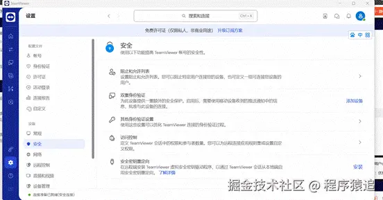 TeamViewer 将所有安全功能都整合在了左侧的「设置」->「安全」菜单中,用户在这里可以设置阻止和允许列表、双重身份验证、其他身份验证、访问控制和安全密钥重定向核心防护功能。这样的布局让安全设置一目了然,管理员能快速找到需要的防护选项。