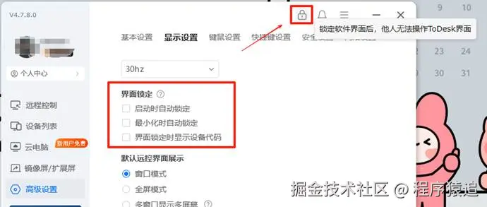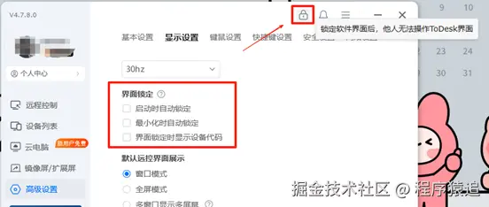 此外,我还发现了只有ToDesk提供界面锁定,要是主控端临时离开桌面,可以直接锁定客户端界面,或者是在启动时/最小化时自动锁定,提供给某些暂时无需远控但想保护界面信息时使用。