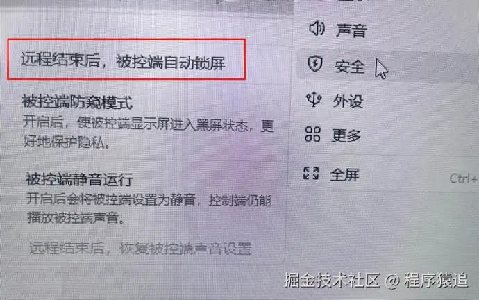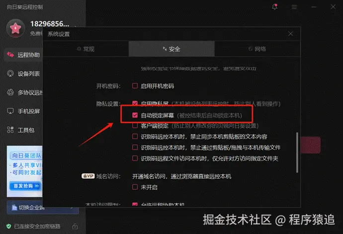 在“高级设置”——>“安全设置”——>勾选“远控结束自动锁定本机”即可。