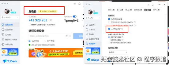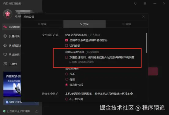 实测的时候发现,向日葵客户端有个很靠谱的双重验证功能。**开启向日葵的双重验证:**进入设置→安全→勾选"双重验证访问"。启用后,其他账号远程连接时需验证码和你的手动确认,安全性高,作用类似于ToDesk的非同账号需本设备手动同意,但是设备划分没有那么清楚,只强调了控制端。