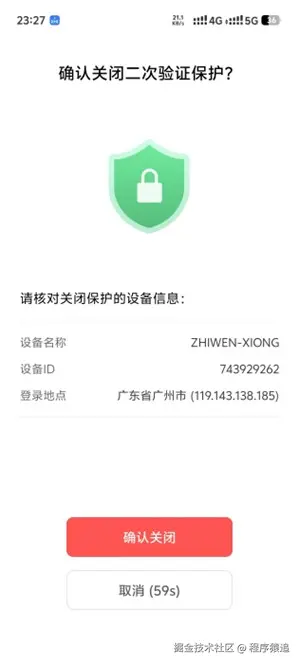 开启二次验证后,你的主设备会弹出60秒确认提醒。一旦同意开启,界面立即变成绿色"已启用"状态,意味着所有与本机的连接都需经过主设备的同意才可建立!