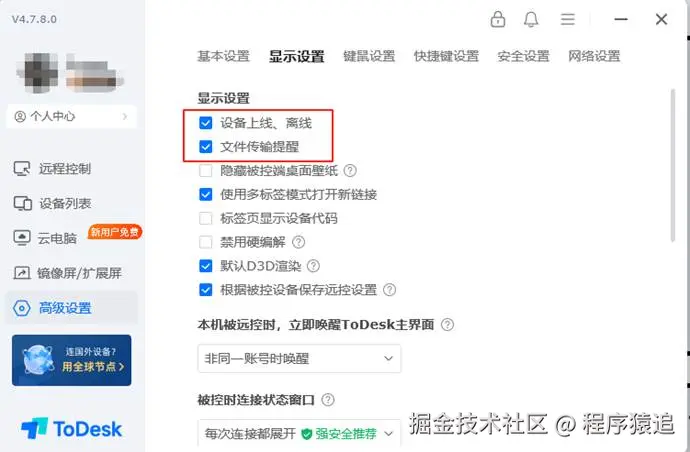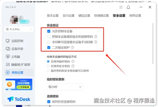 ToDesk权限管理系统不仅功能全面,而且设计精巧。主要在【安全设置】里的【安全验证】开启。这块有三个重点:得先勾上 “允许控制本设备”,不然远程连不上;要是开了**“控制本设备需校验本机锁屏密码”,远程操控的时候得输锁屏密码;勾选“非同账号连接需本设备手动同意”****,**要是别人用不同账号连你,每次都得你在自己设备上点同意才行,这样防止设备乱连。