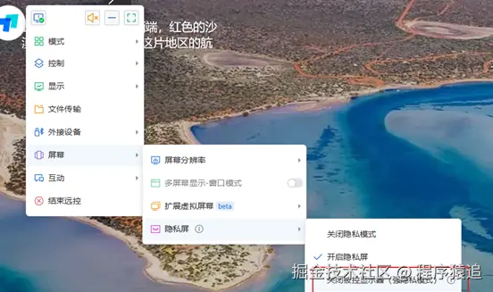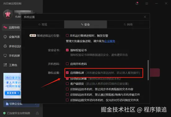 向日葵远程控制软件具备传统隐私屏功能模块。用户可在系统“隐私设置”界面勾选“启用隐私屏”选项,而后于远程控制会话的菜单栏中依次点击“桌面”→“高级设置”→“隐私屏”。
