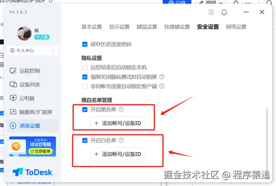 ToDesk 还特别设置了设备黑白名单功能,可以精确控制哪些设备能够连接或禁止连接你的电脑。