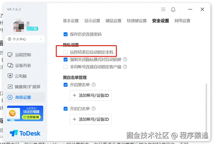 远程会话结束后的安全防护同样不容忽视。ToDesk在这方面提供了多项实用功能,例如远程结束后自动锁定。