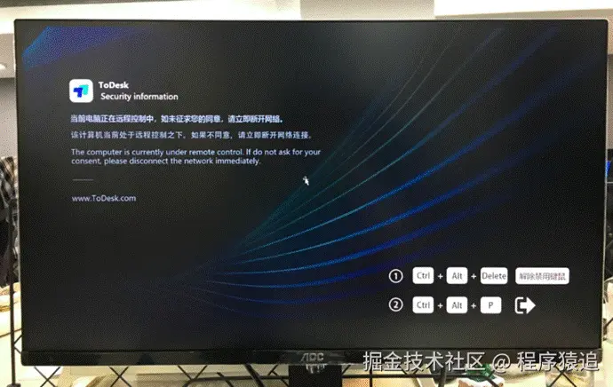 5、为了保证大家的操作安全,在隐私屏的保护界面会看到下方的【隐私屏】退出快捷键,只需要在被控设备上,摁下组合键CTRL+alt+P即可快速退出隐私屏。