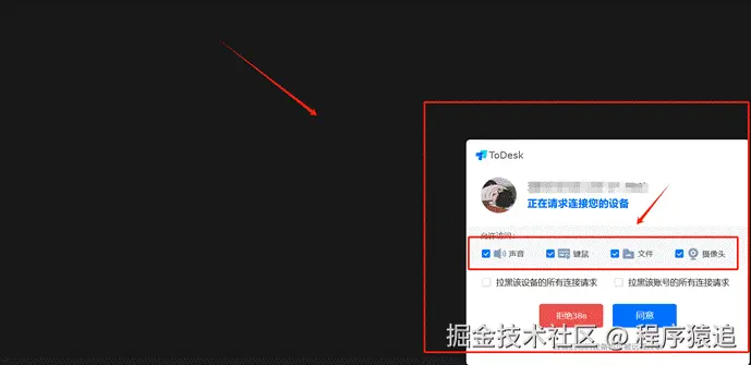开启后,远程请求会触发被控端弹窗,显示连接详情,用户可实时选择允许/拒绝,并能单独管控操作权限(如控制、同步剪贴板、文件传输等)。