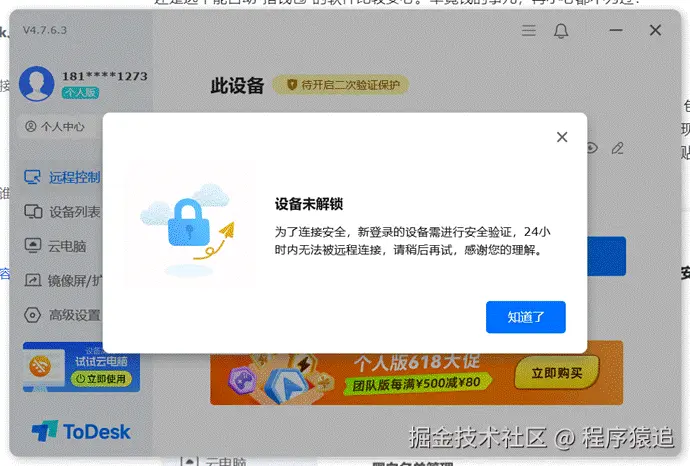 ToDesk创新性地设置了"24小时安全冷静期",新注册用户在首日无法启用手机被控功能。这一设计旨在强化账户安全防护体系,通过强制性的缓冲期使得户充分了解产品安全特性,不会轻易上头产生交易,骗子也就不会得逞。系统在此期间会主动推送安全指引,帮助用户建立规范的使用习惯。