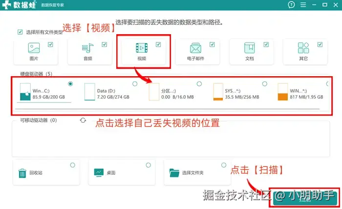 步骤1: 打开软件首页,在上部分勾选自己需要的文件类型(需要找回视频可以勾选【视频】),然后在下部分勾选视频文件丢失的位置,选好后再点击【扫描】;