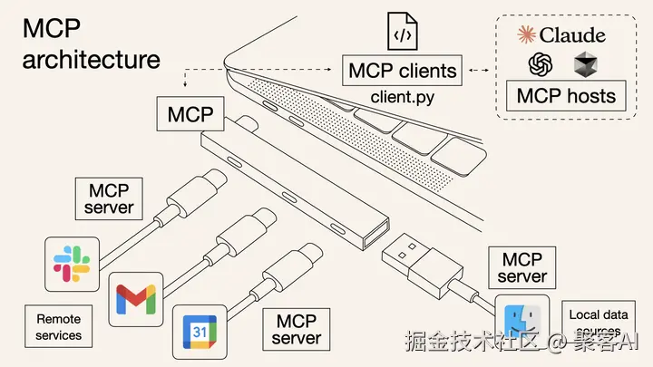 - 解耦设计:大模型(Client)专注推理决策,外部操作(Server)交给工具执行