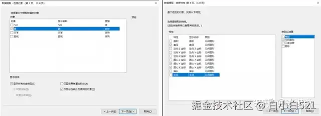 勾选需要提取的对象,选择几何图形,勾选【直径】,X坐标,Y坐标,完成后点击【下一页】。