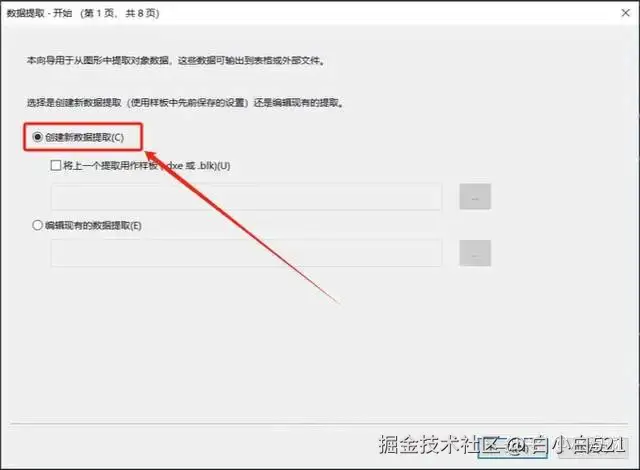 点击浩辰CAD软件的菜单栏【工具】—【数据提取】。勾选【创建新数据提取】,并点击【下一页】,设置数据保存位置。
