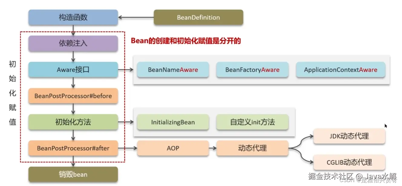 Bean的生命周期的执行流程如图: