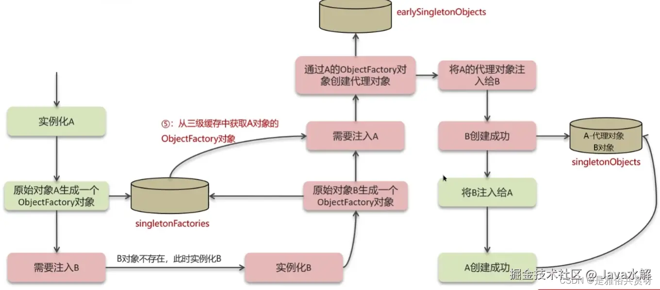 第四,B需要注入A,通过三级缓存中获取ObjectFactory来生成一个A的对象 同时存入二级缓存,这个是有两种情况,一个是可能是A的普通对象,另外 一个是A的代理对象,都可以让ObjectFactory来生产对应的对象,这也是三 级缓存的关键。